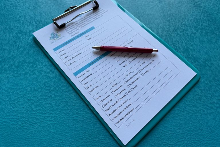 Fülle bitte außerdem den Anamnesebogen für dein Tier aus. Diesen findest du zum herunterladen weiter unten. Sende mir diesen gerne vorab zu oder bringe ihn spätestens zum Termin mit.